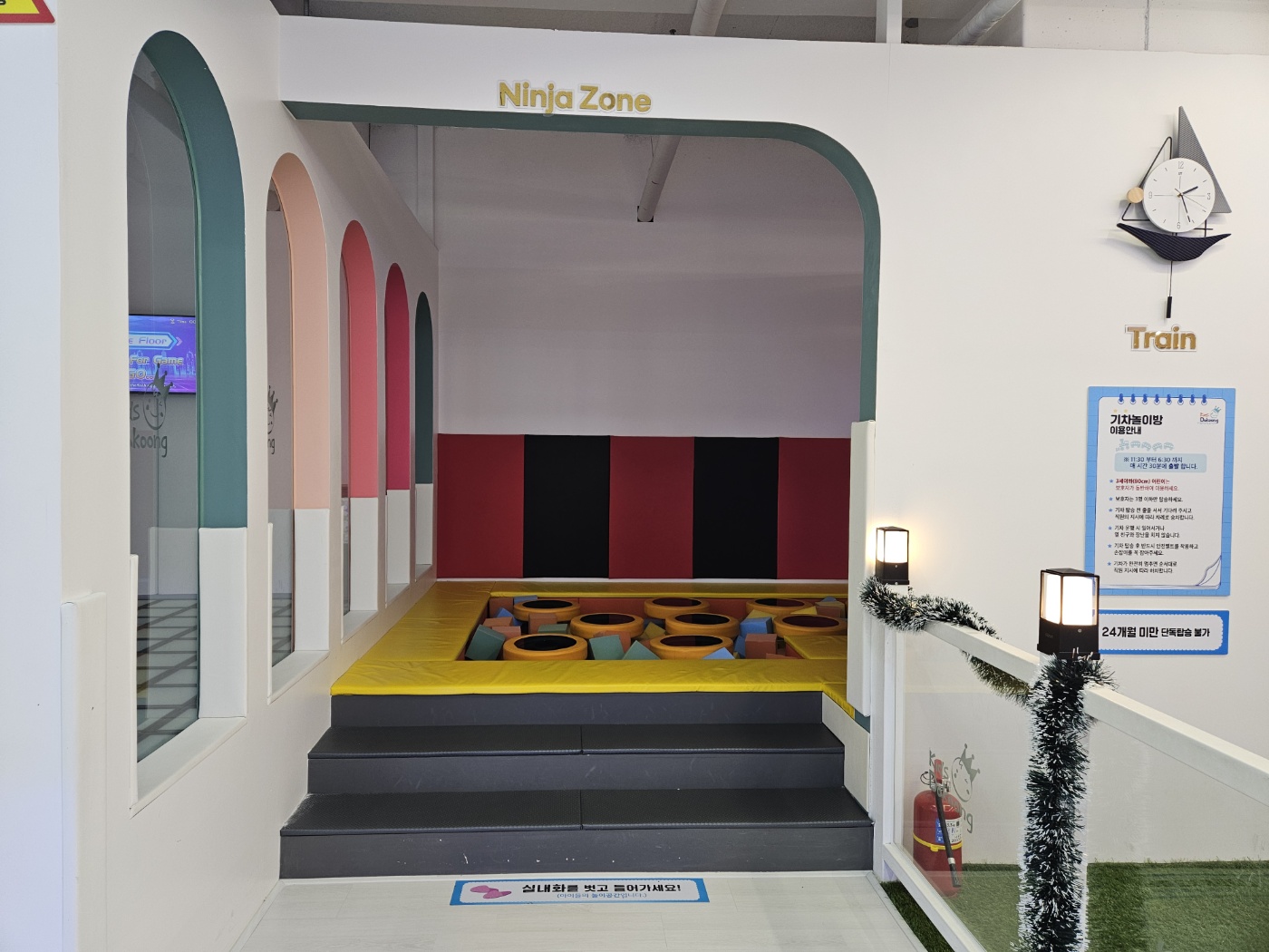 실내에는 트램폴린, 미끄럼틀, 기차 놀이, 블록 놀이터, 볼풀장 등등… 아이가 심심할 틈 없이 놀 수 있는 공간이 정말 다양했어요. 저희 아이들은 특히 테마공간(주방놀이나 코스프레 옷들)과 닌자존 코너에서 오랜 시간 머물렀답니다.